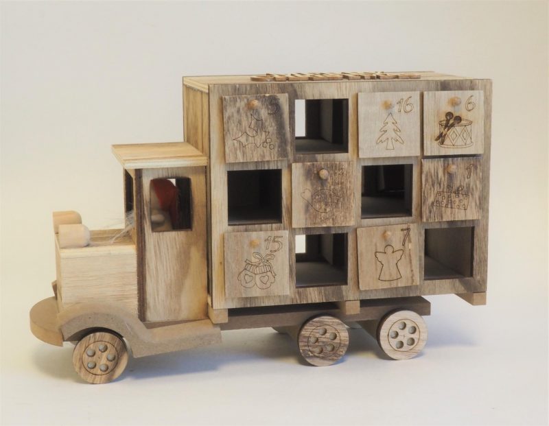 Puidust jõulukalender. 29x10.5 cm, kõrgus 18.5 cm. Osa sahtleid puudu. Seisukord: kasutatud, kulunud.