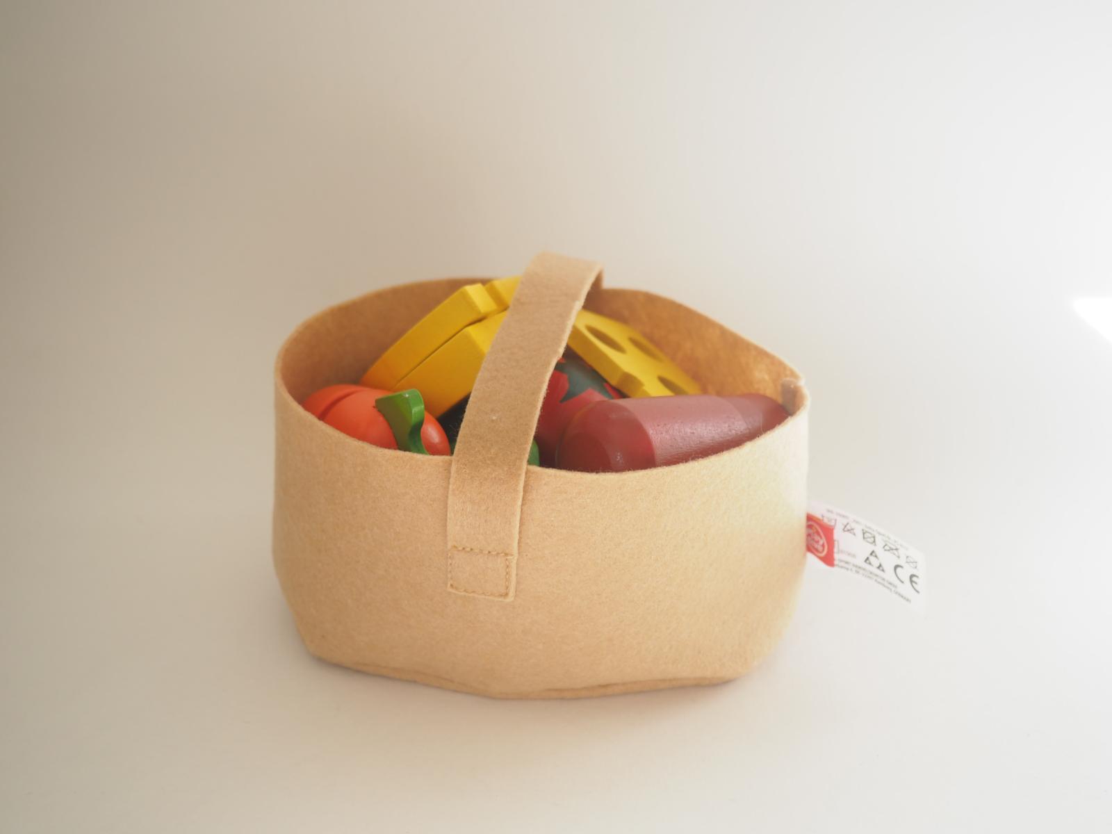 Puidust juurviljad riidest korvis. Korv 15x14 cm, kõrgus 8 cm. Seisukord: kasutatud, heas korras.