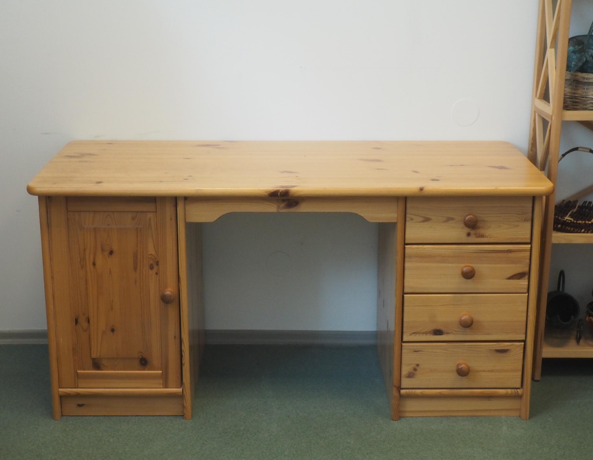 Puidust kirjutuslaud. 145x62 cm, kõrgus 72 cm. Seisukord: kasutatud, kulunud.