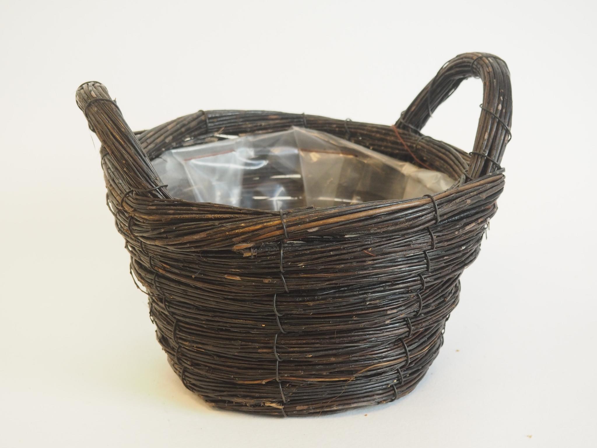 Punutud korv. Läbimõõt 19.5 cm, kõrgus (sangani) 16.5 cm. Seisukord: kasutatud, kulunud.