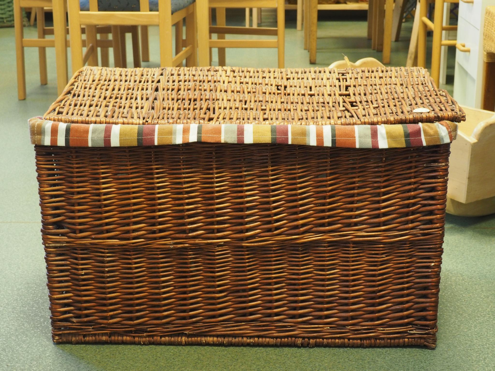 Punutud korv. 77x45 cm, kõrgus 46 cm. Riie määrdunud. Seisukord: kasutatud, kulunud.