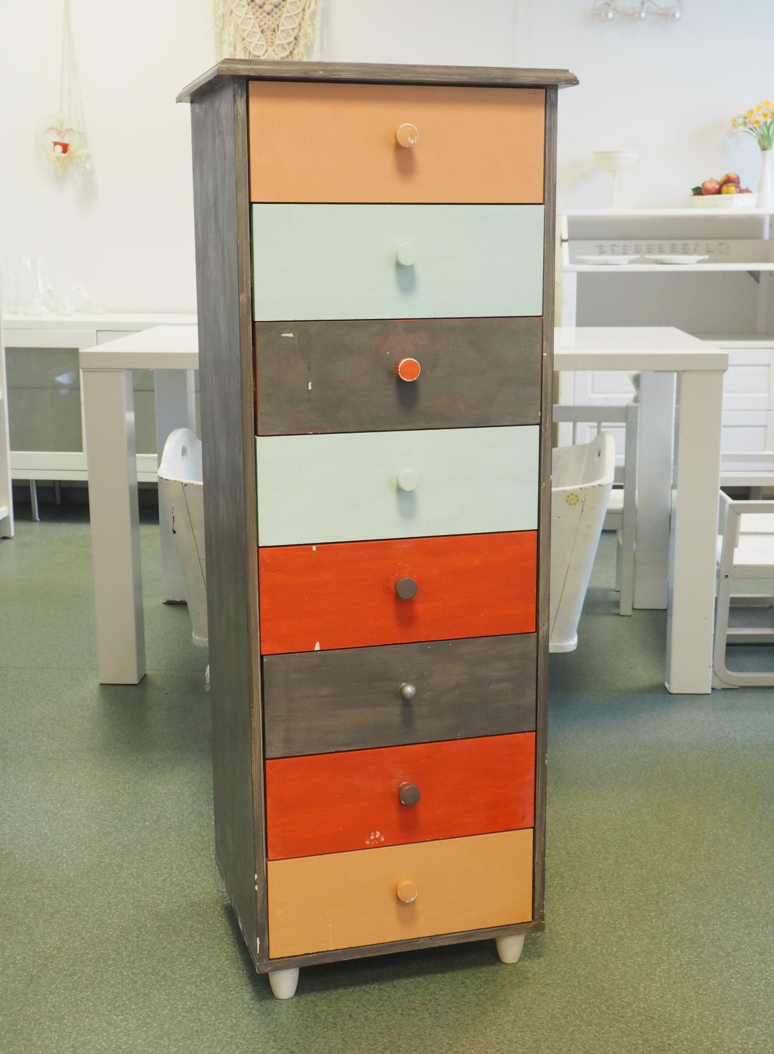 Saepuruplaadist kummut. 44.5x37 cm, kõrgus 120 cm. Seisukord: kasutatud, kulunud.