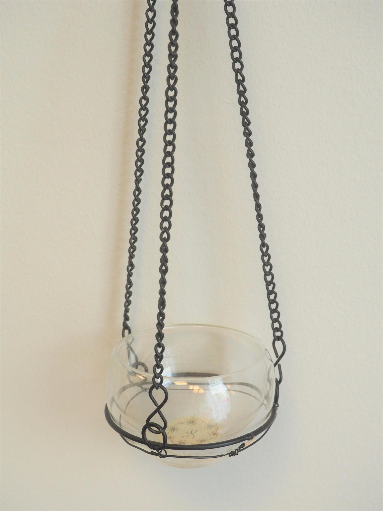 Metallist/klaasist küünlaalus. Pikkus koos ketiga 44 cm. Seisukord: kasutatud, heas korras.