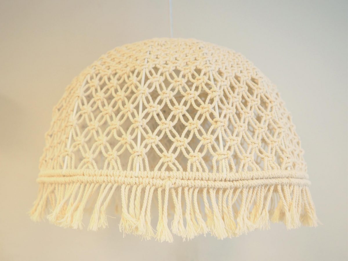 Makramee laelamp. Läbimõõt 37 cm, kõrgus 29 cm. Seisukord: kasutatud, heas korras.