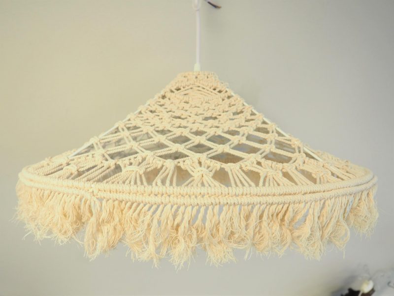 Makramee laelamp. Kupli läbimõõt 45 cm, kõrgus 18 cm. Seisukord: kasutatud, heas korras.