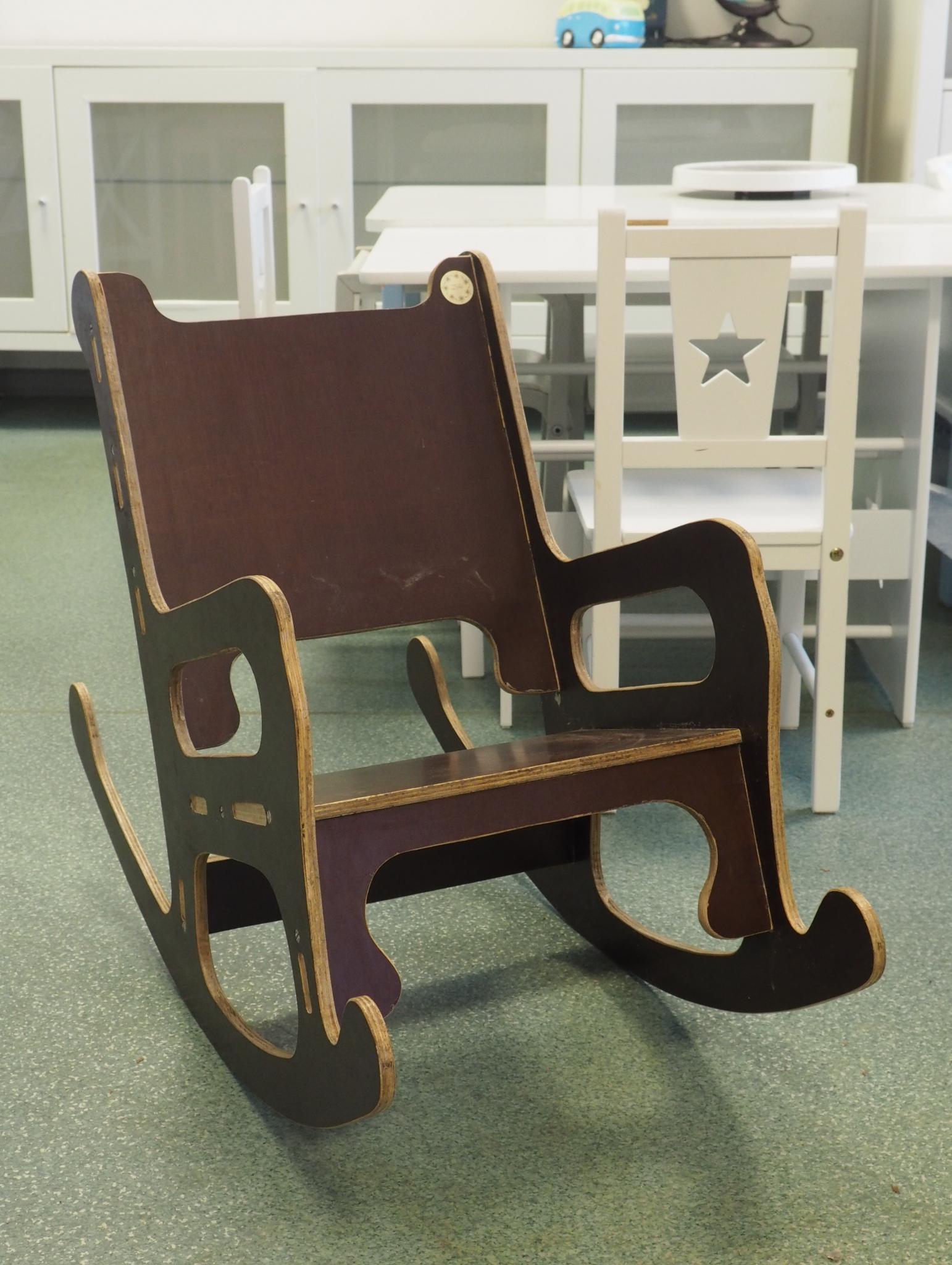 Vineerist laste kiiktool. Istme kõrgus 26 cm, seljatoe kõrgus 54.5 cm, laius 33.5 cm. Seisukord: kasutatud, kulunud.