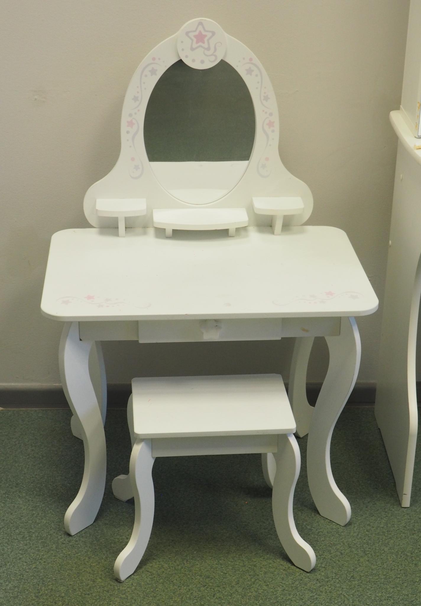 Saepuruplaadist laste peeglilaud pingiga. Laud 60x41 cm, laua kõrgus 48.5 cm, peegli osa kõrgus 90.5 cm, pink 28.5x19.5 cm, kõrgus 29 cm. Plekiline! Seisukord: kasutatud, kulunud.