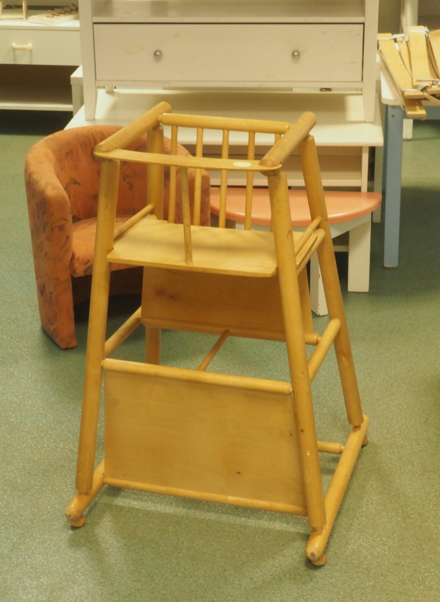Puidust laste söögitool. Istme kõrgus 54 cm, seljatoe kõrgus 74 cm. Seisukord: kasutatud, kulunud.