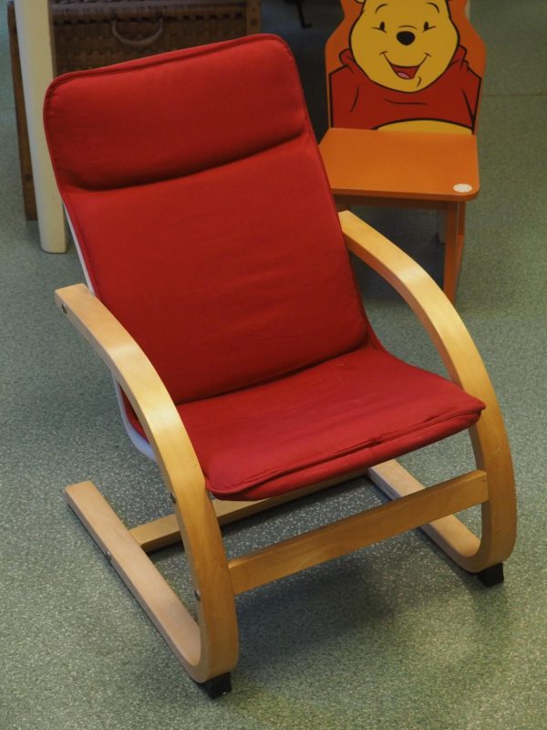 Puidust laste tugitool tekstiilist kattega. Istme kõrgus 30 cm, seljatoe kõrgus 60 cm, laius 44 cm. Kattel plekid! Seisukord: kasutatud, kulunud.