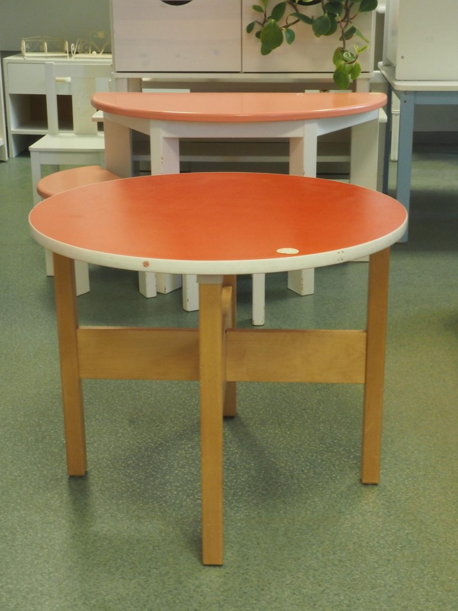 Saepuruplaadist/puidust lastelaud. Läbimõõt 59 cm, kõrgus 48 cm. Seisukord: kasutatud, kulunud.