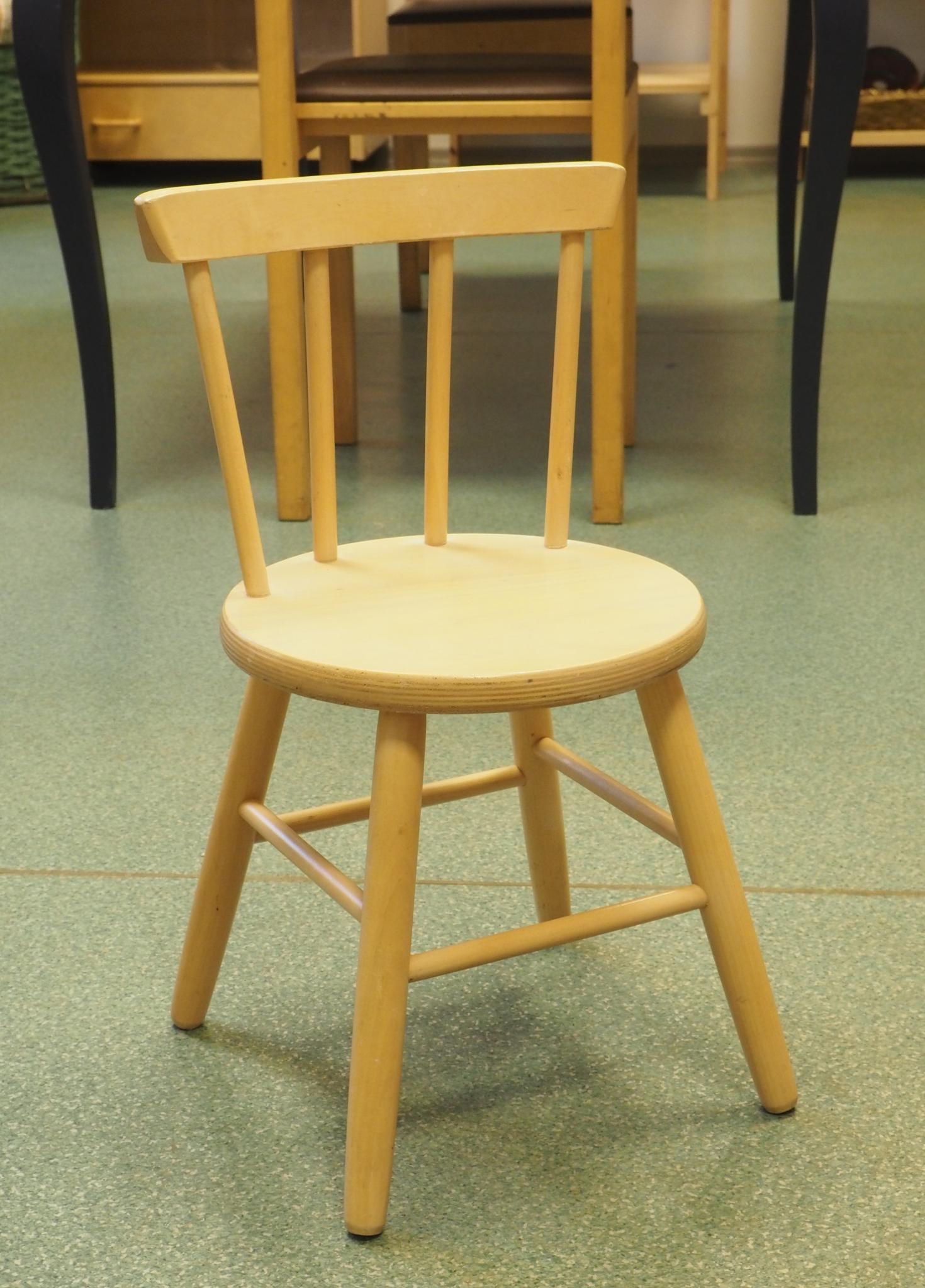 Puidust lastetool. Istme läbimõõt 27 cm, istme kõrgus 29.5 cm, seljatoe kõrgus 52.5 cm. Seisukord: kasutatud, kulunud.