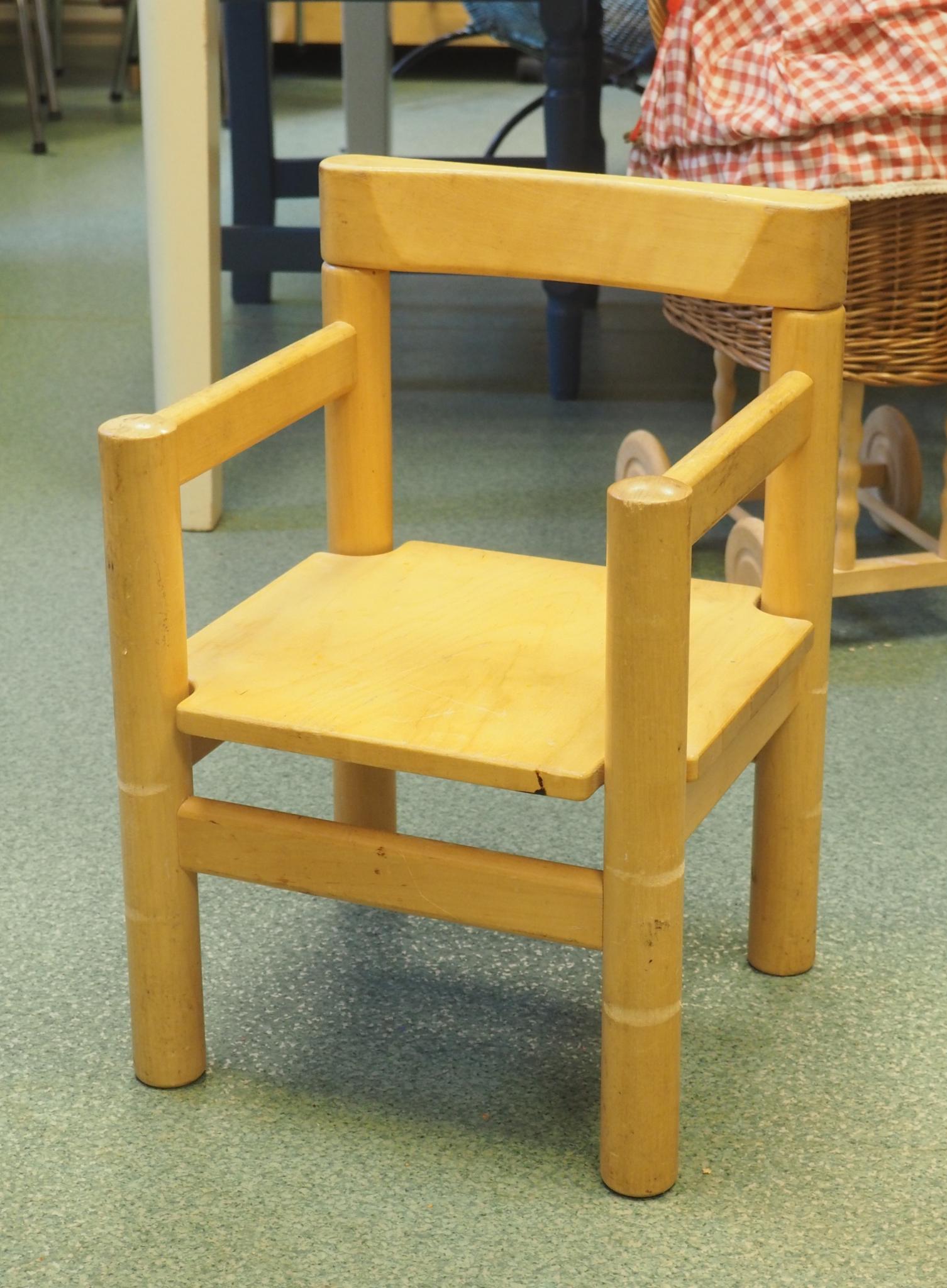 Puidust lastetool. Istme kõrgus 22 cm, seljatoe kõrgus 44 cm, laius 30 cm. Seisukord: kasutatud, kulunud.