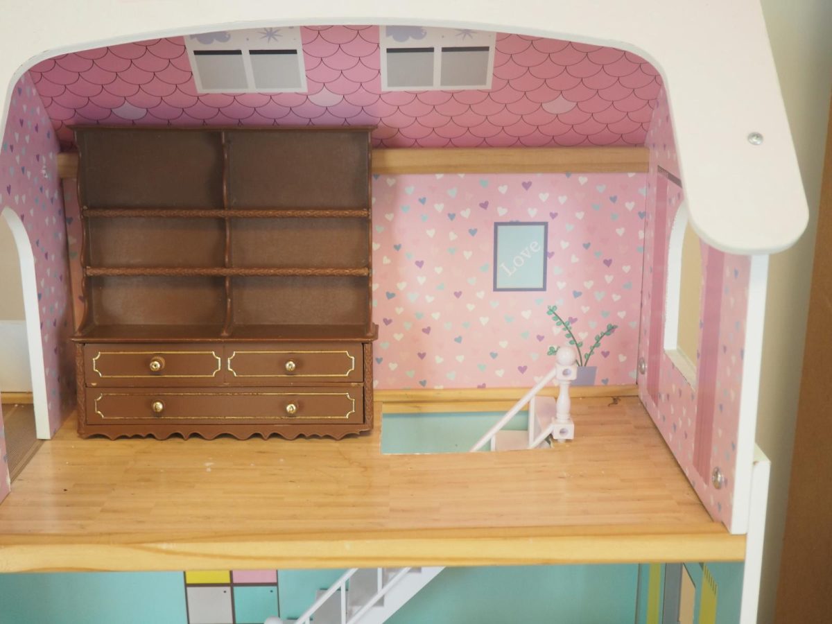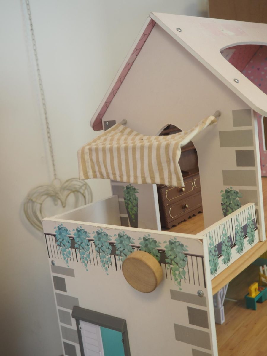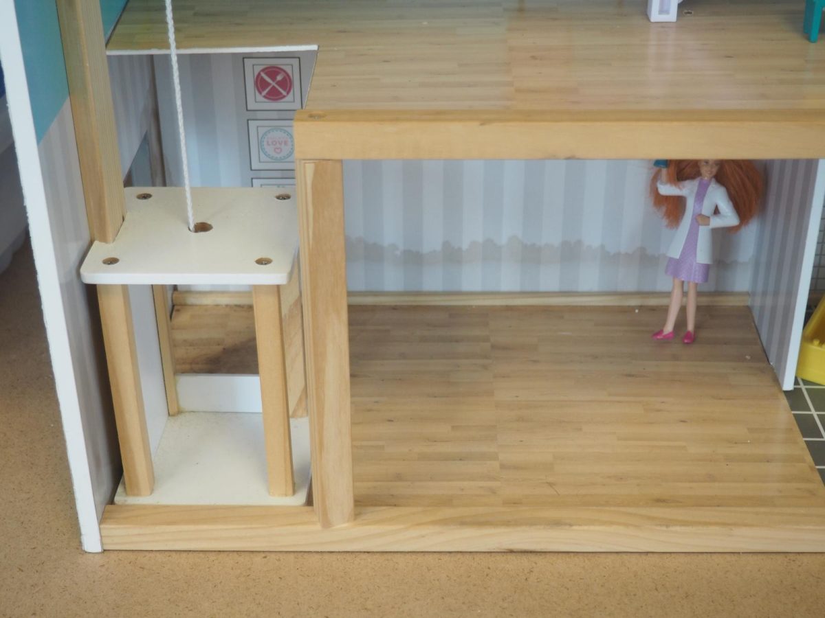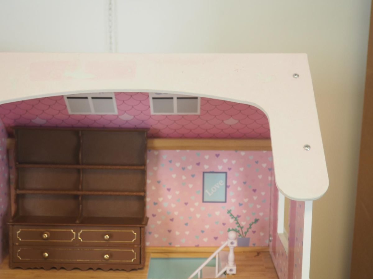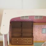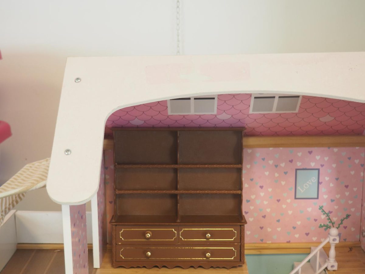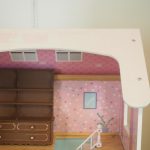 Saepuruplaadist/puidust nukumaja. 61x26 cm, kõrgus 80 cm. Seisukord: kasutatud, kulunud.