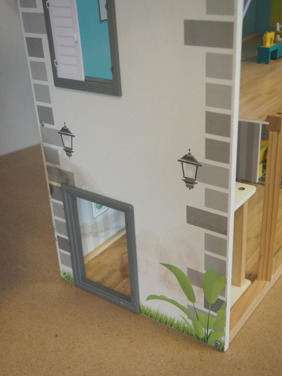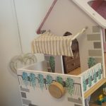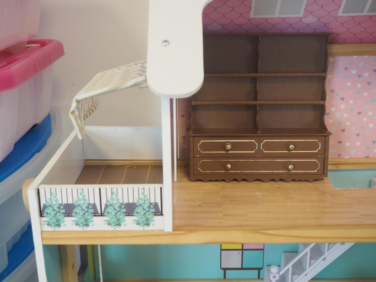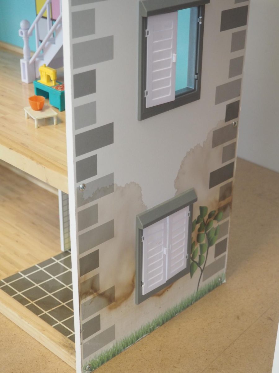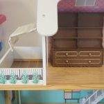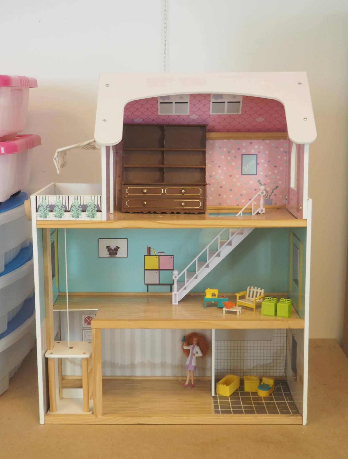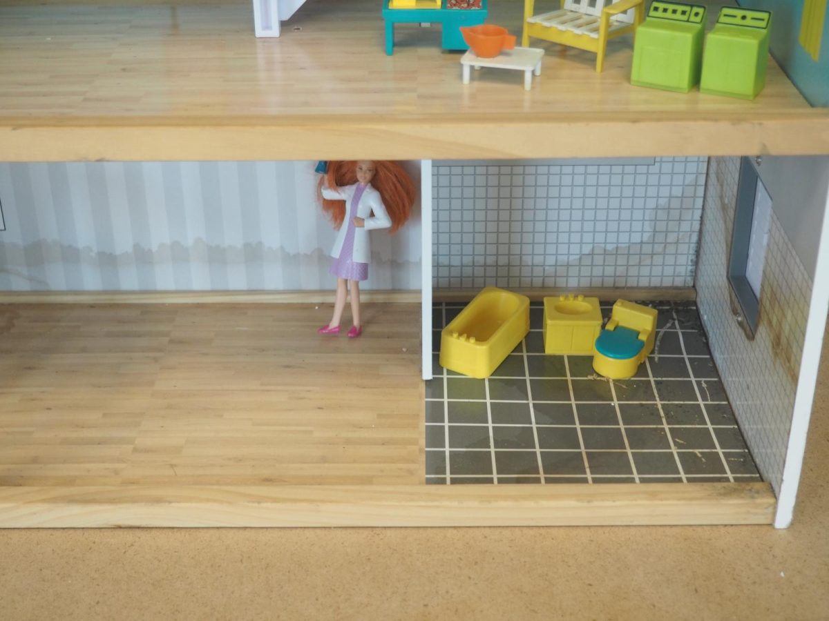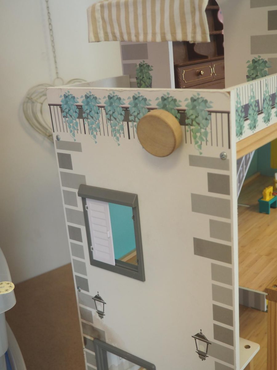 Saepuruplaadist/puidust nukumaja. 61x26 cm, kõrgus 80 cm. Seisukord: kasutatud, kulunud.