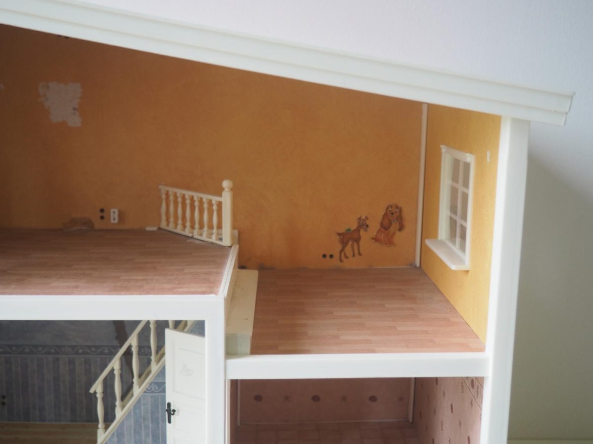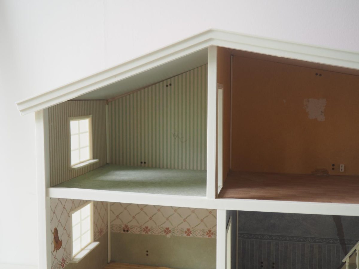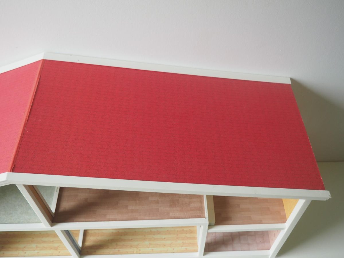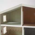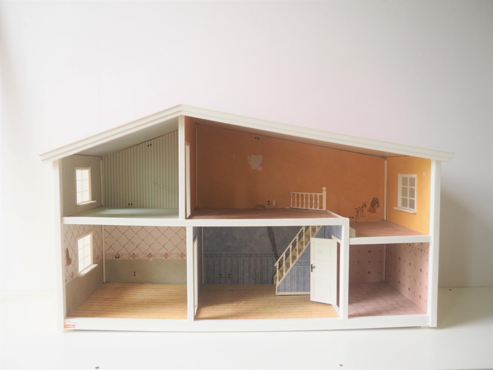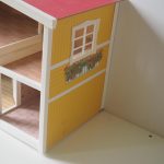 Saepuruplaadist/plastikust nukumaja. 70x26 cm, kõrgus 39 cm. Seisukord: kasutatud, kulunud.
