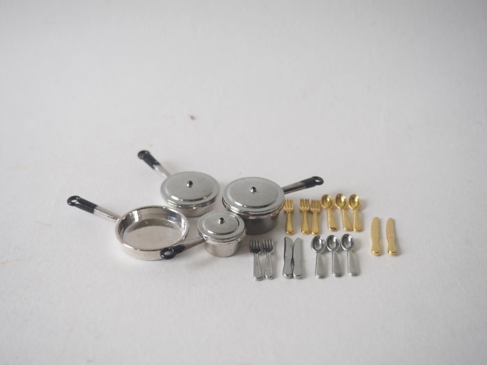 Miniatuursed nukunõud. Pottide läbimõõt 1.8 cm kuni 2.5 cm, söögiriistade pikkus 2 cm. Seisukord: kasutatud, heas korras.
