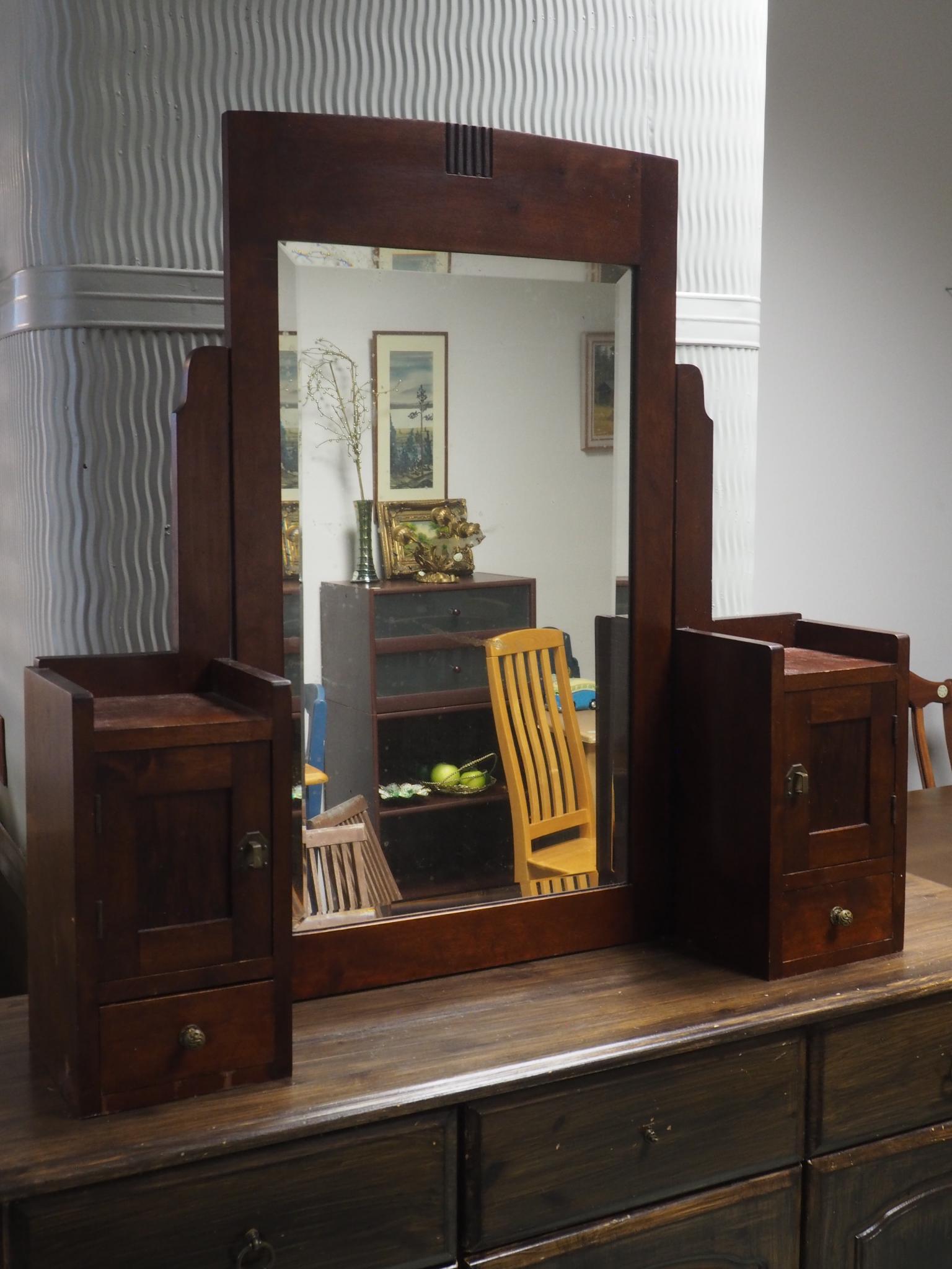 Puidust vana kummuti peegel. 95x20 cm, kõrgus 92 cm. Seisukord: kasutatud, kulunud.