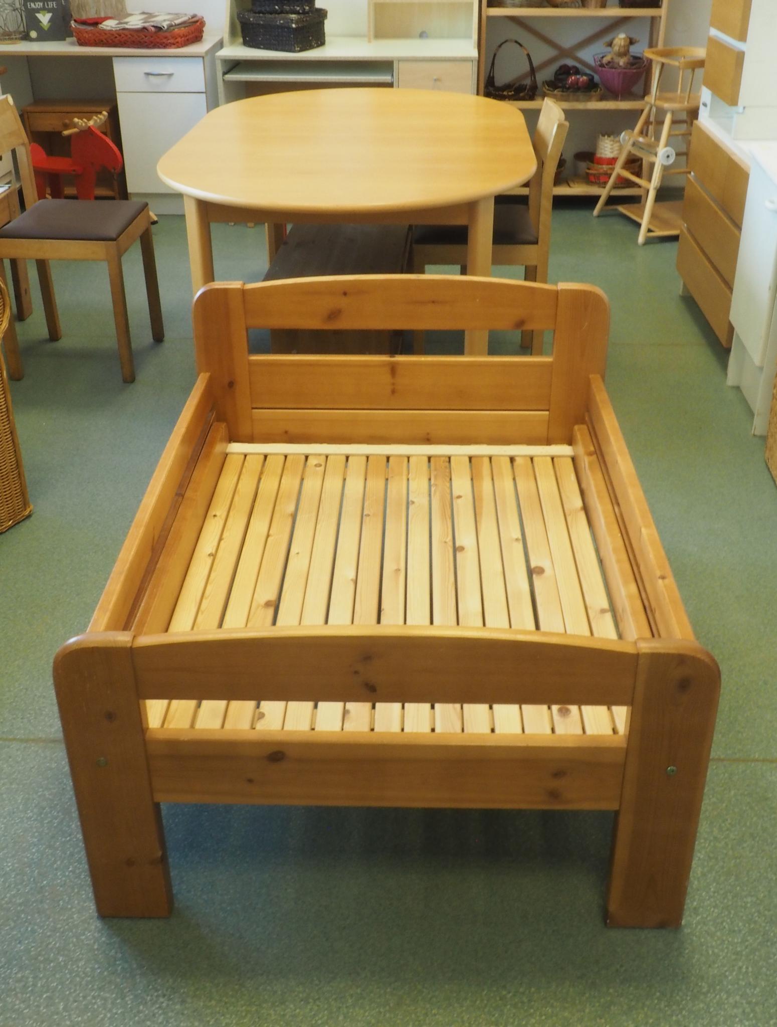 Puidust pikendatav lastevoodi. Välimised mõõdud kinniselt 108x85 cm, lahtiselt 197x85 cm. Sisemised mõõdud kinniselt 102x74 , lahtiselt 191x74 cm. Seisukord: kasutatud, kulunud.