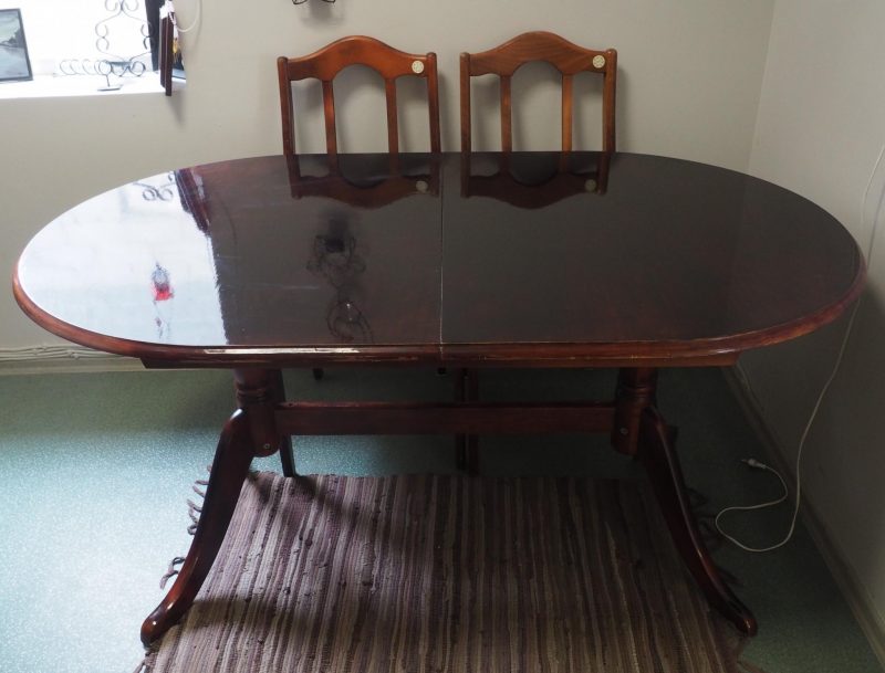 Puidust pikendatav söögilaud. 90x150 cm (+ vaheplaat 45 cm), kõrgus 74 cm. Seisukord: kasutatud, kulunud.