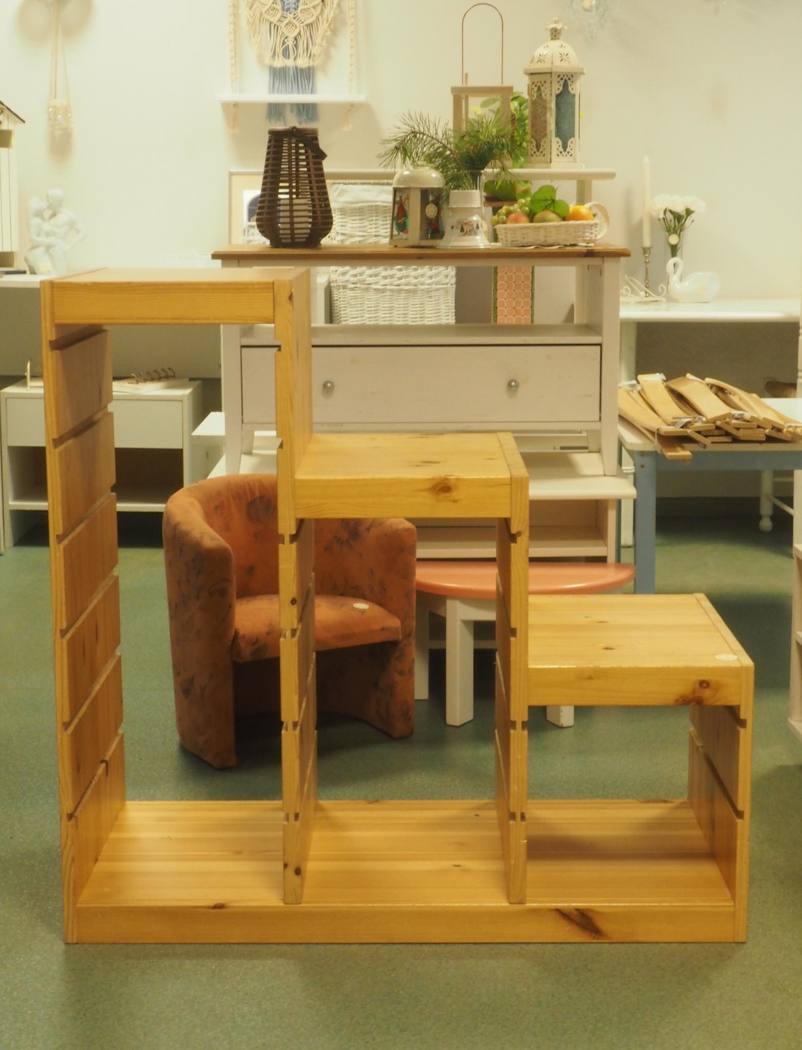 Puidust riiul. 93.5x43.5 cm, kõrgus 90.5 cm. Sahtlid/korvid puudu! Seisukord: kasutatud, kulunud.