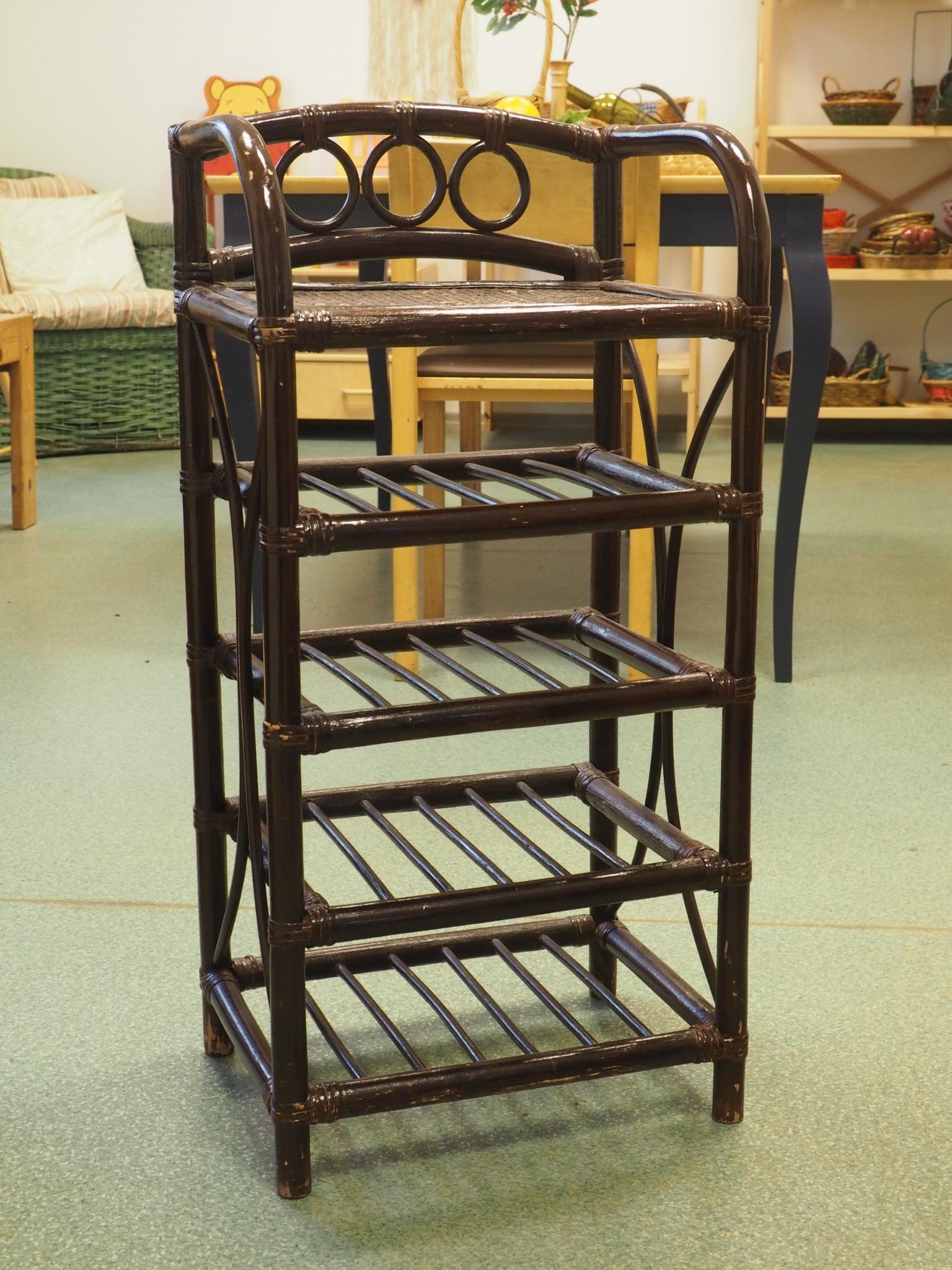 Rotangist riiul. 38x28.5 cm, kõrgus 77 cm. Seisukord: kasutatud, kulunud.