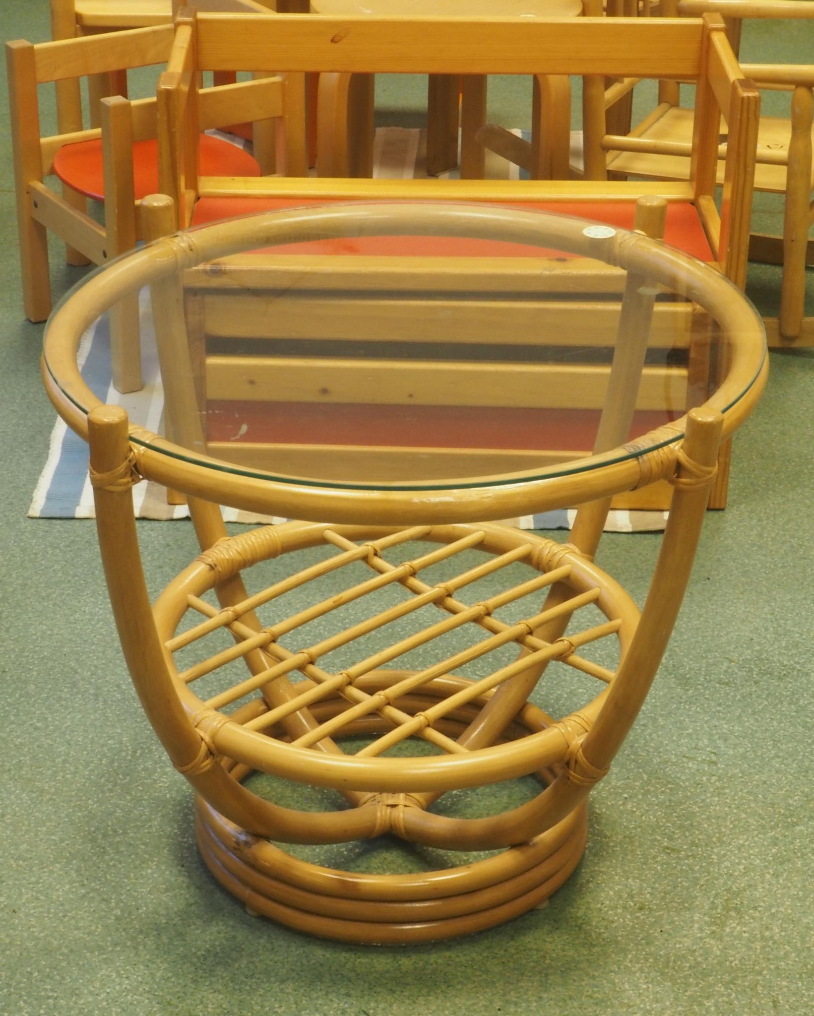Rotanglaud klaasist plaadiga. Läbimõõt 60 cm, kõrgus 53 cm. Seisukord: kasutatud, heas korras.