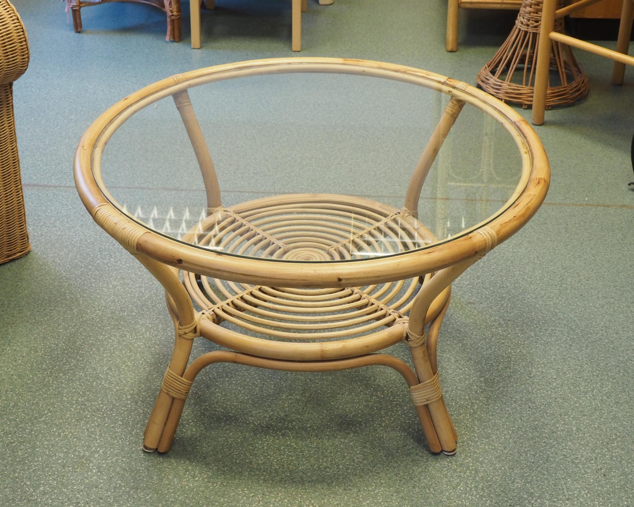 Rotangist laud klaasplaadiga. Läbimõõt 45 cm, kõrgus 80 cm. Seisukord: kasutatud, heas korras.