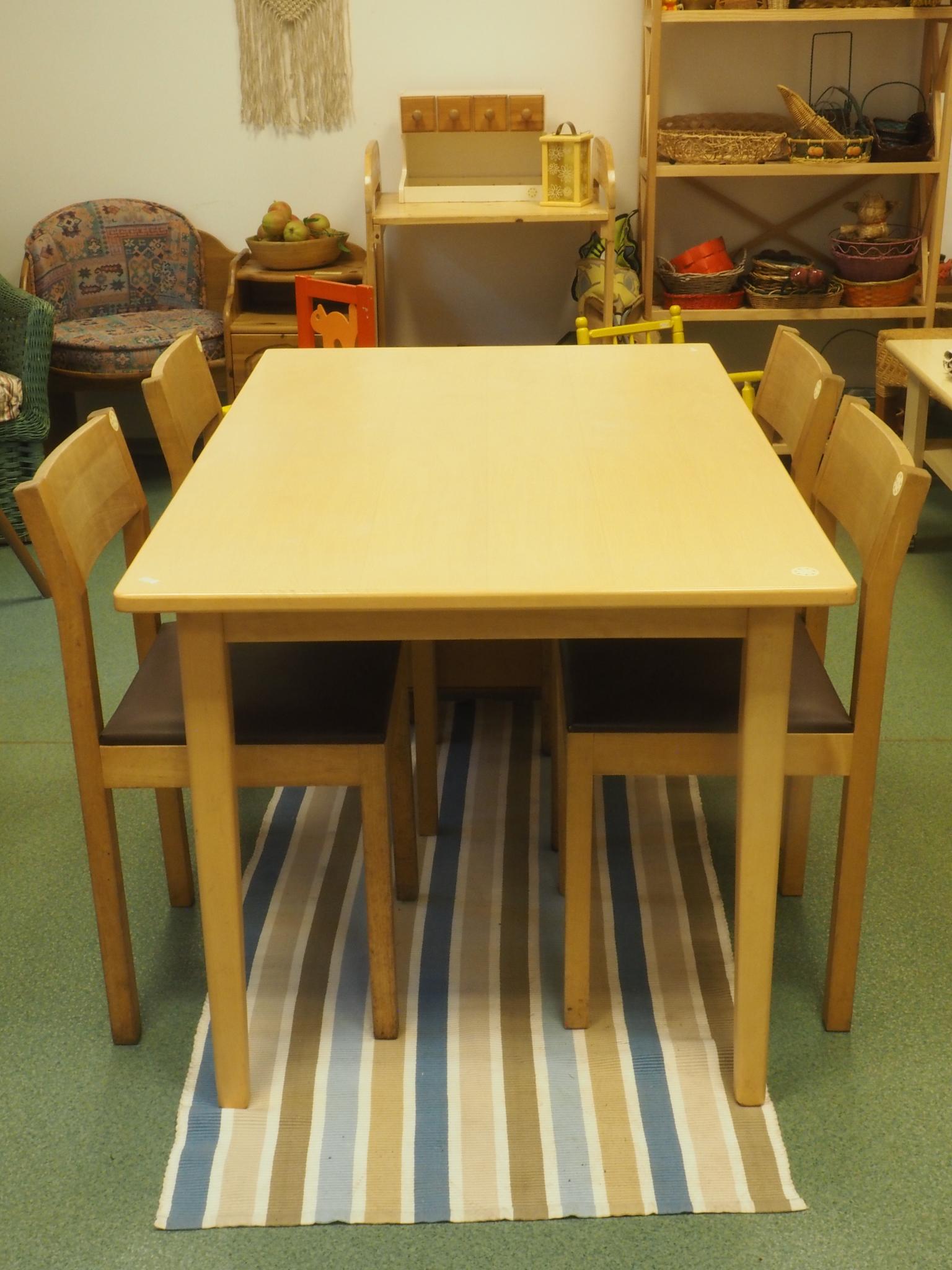 Puidust söögilaud. 125x80 cm, kõrgus 72 cm. Seisukord: kasutatud, kulunud.
