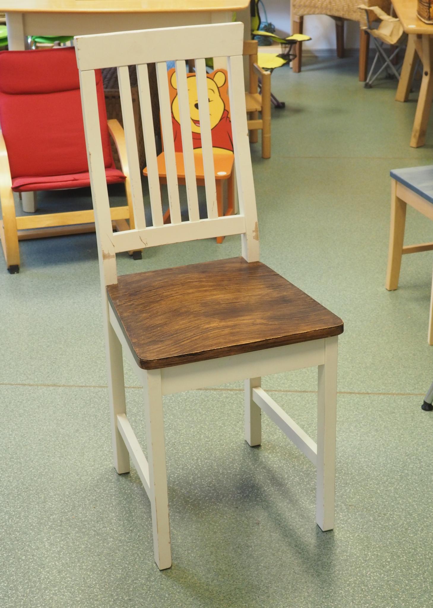 Puidust söögitool. Istme kõrgus 47 cm, seljatoe kõrgus 95 cm, laius 40 cm. Seisukord: kasutatud, kulunud.