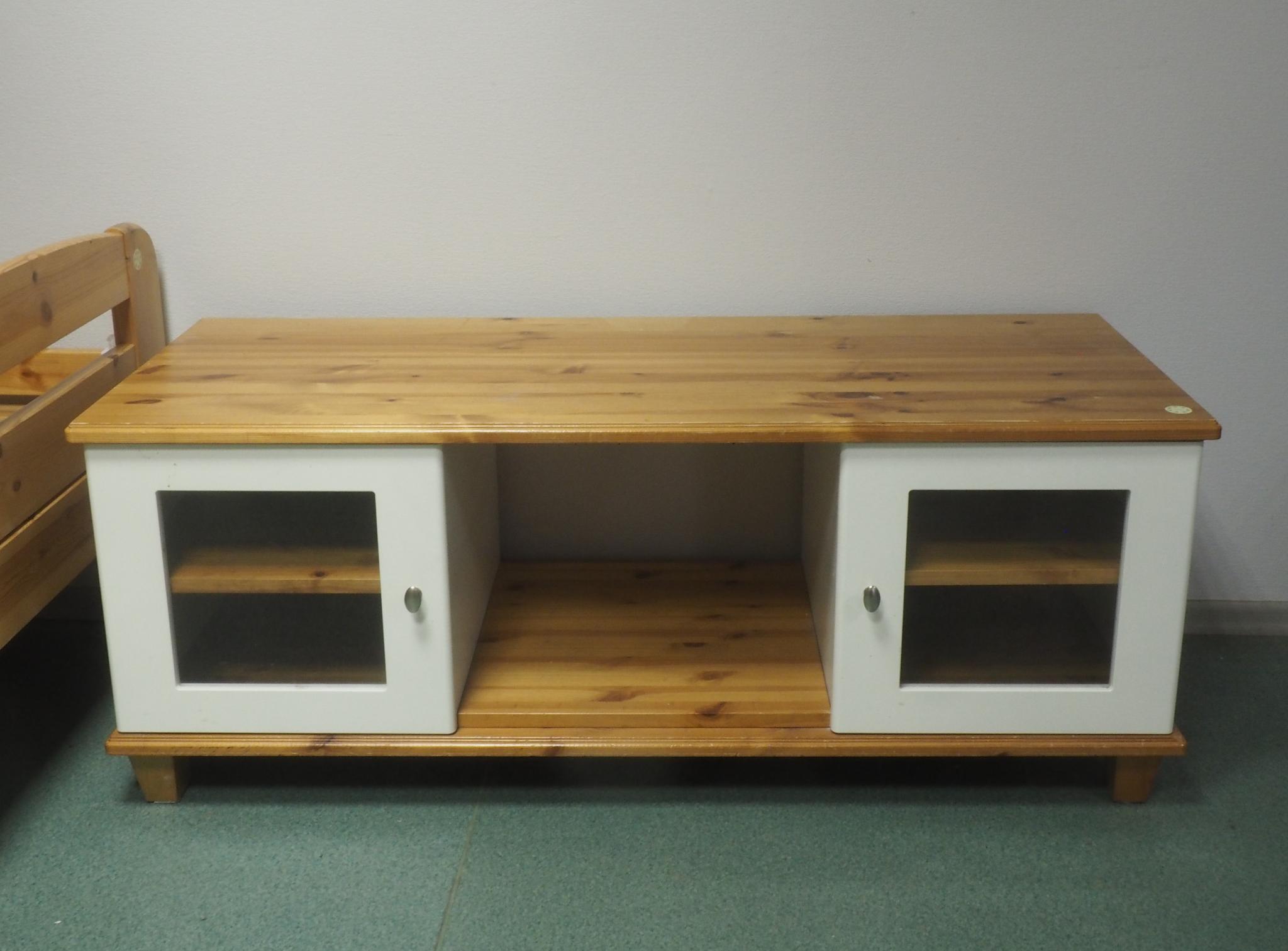 Puidust/saepuruplaadist TV-alus. 128x52 cm, kõrgus 50 cm. Seisukord: kasutatud, kulunud.