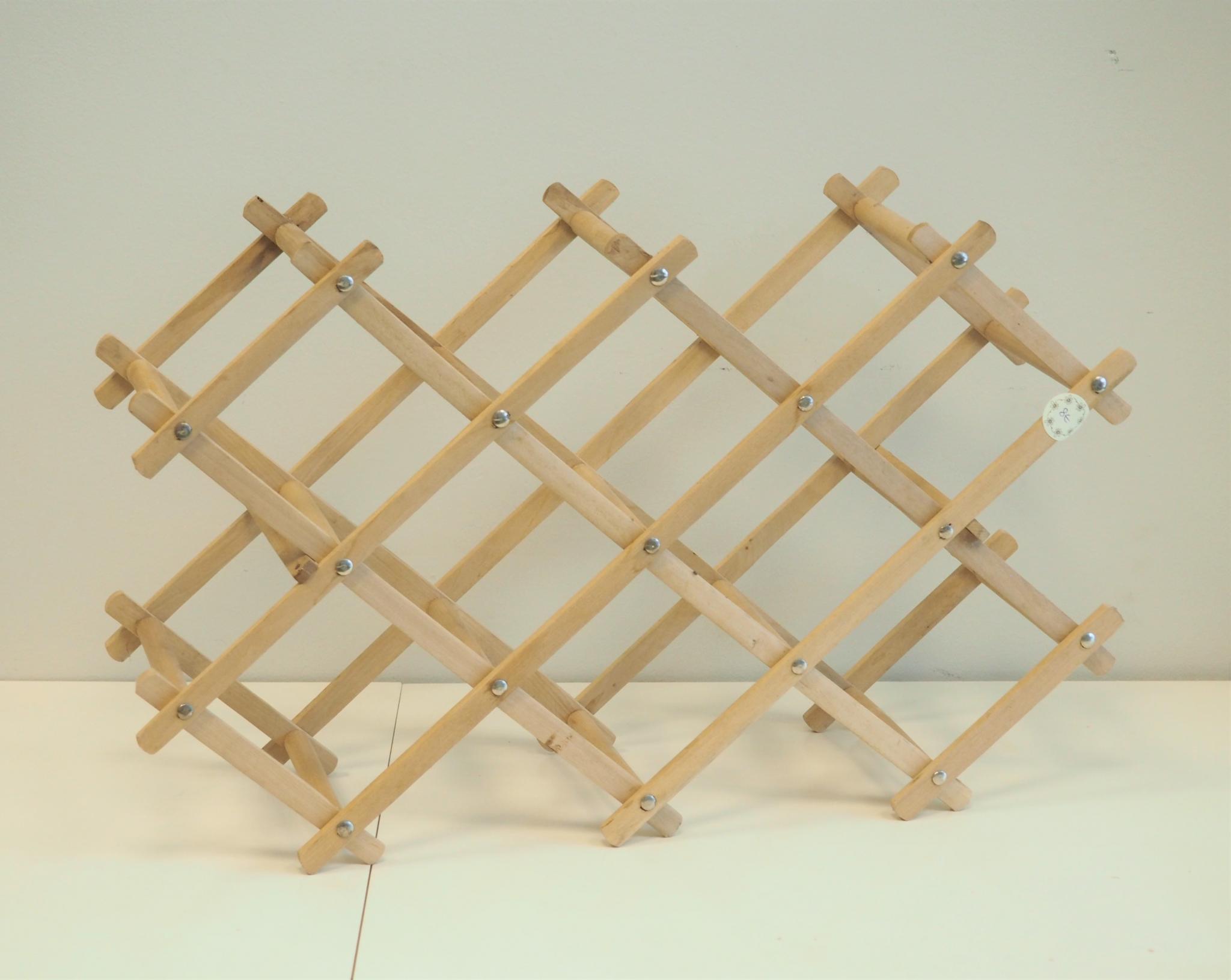Puidust kokkupandav veiniriiul. 59x17.5 cm, kõrgus 36.5 cm. Seisukord: kasutatud, heas korras.